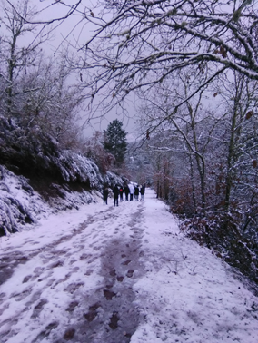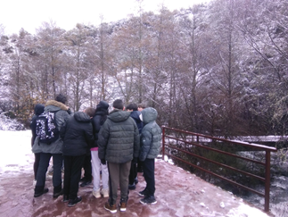 A pesar de la nevada nocturna, los alumnos de 1º de la ESO, han realizado un pequeño recorrido hacia el río Cúa, para analizar el bosque de ribera y las infraestructuras humanas que modifican el entorno.